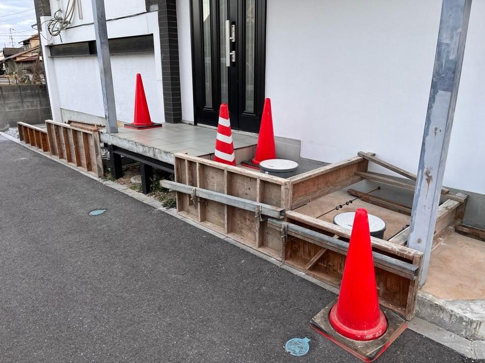 倉敷市上東にて本日、玄関アプローチの改修工事が着工しました。 本日は階段やスロープの型枠と汚水桝の嵩上げや土間コンクリートのチッピング等を行いました。