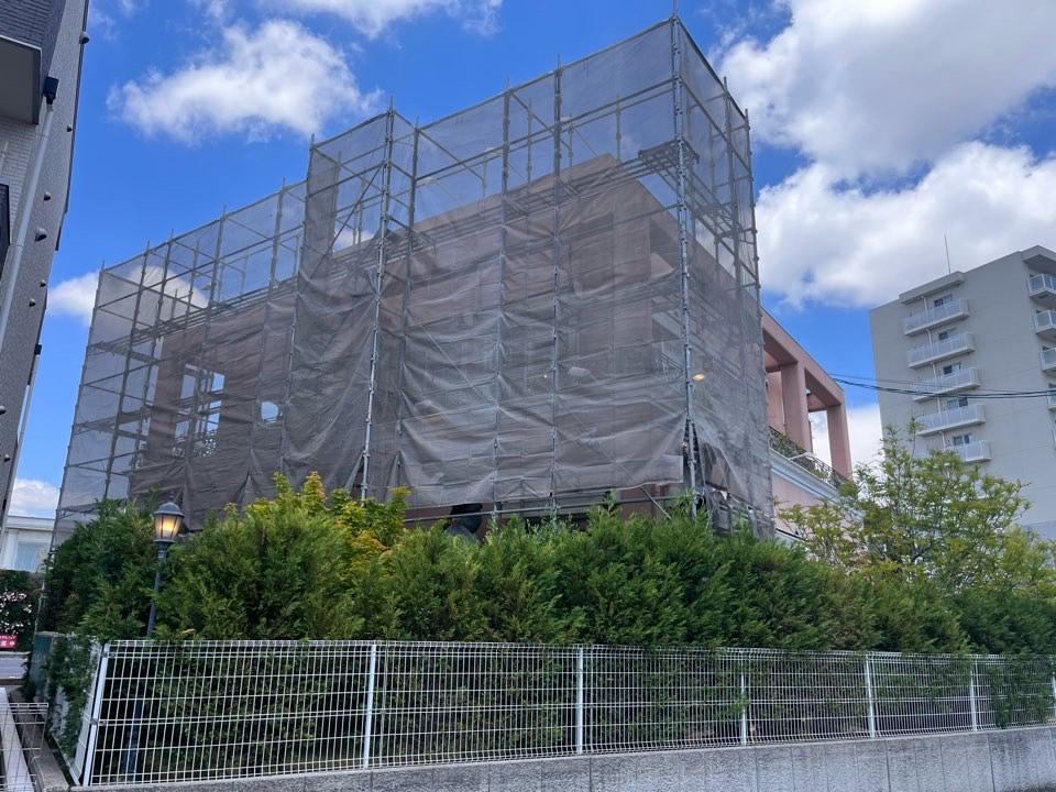 岡山市北区今の某店舗にて外壁補修工事が着工しました。 今日は足場の組立です。