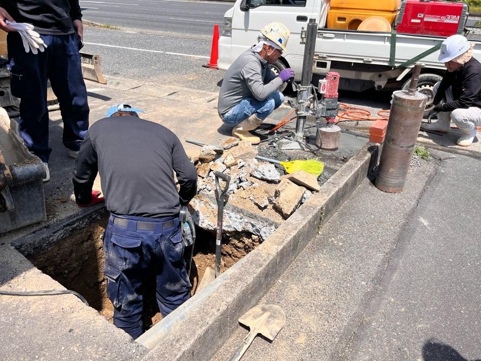 倉敷市中庄の市道にて慢性的に発生する水溜まりを解消するための工事を施工しています。