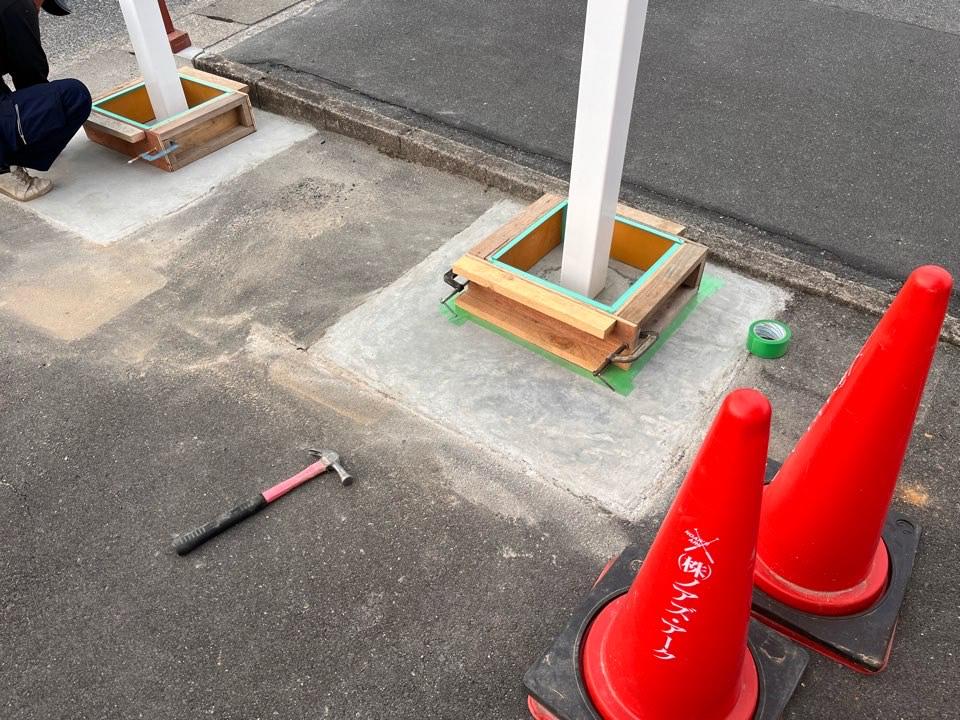 倉敷市沖にて看板の基礎工事を行っています。 今日は柱の根巻きコンクリートを打設します。