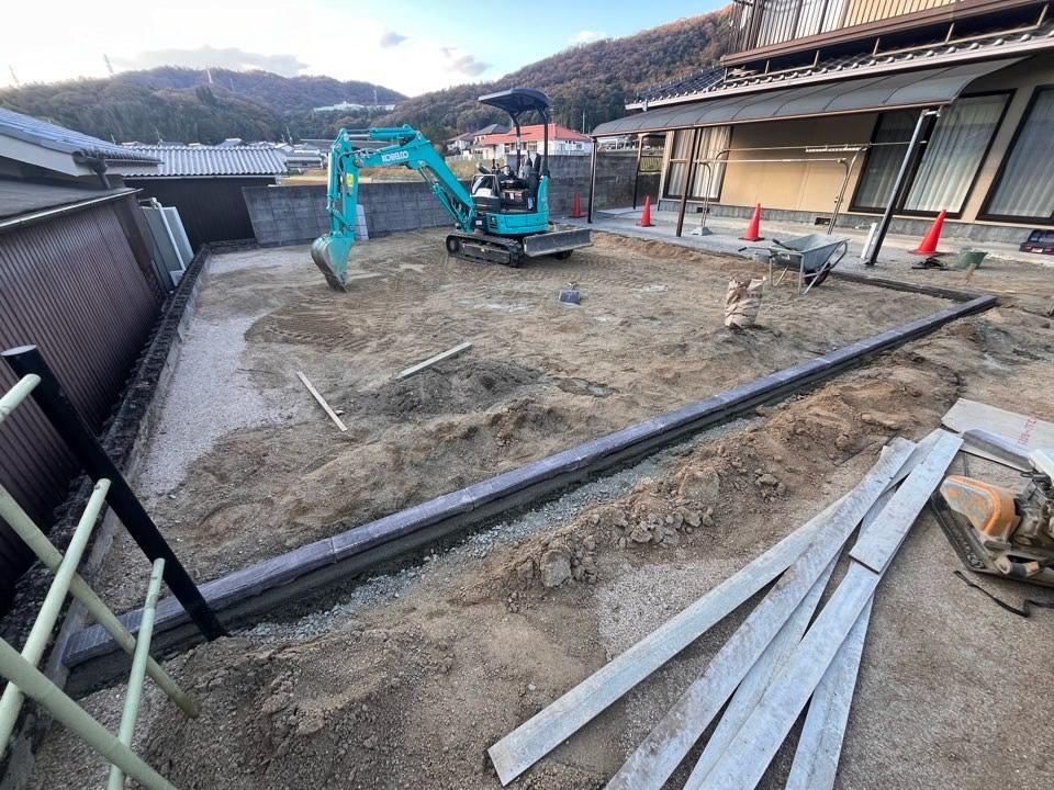 浅口市鴨方町本庄で施工中のガレージ新築工事現場。 建築の完了検査を無事に終え、 外構工事が始まりました。