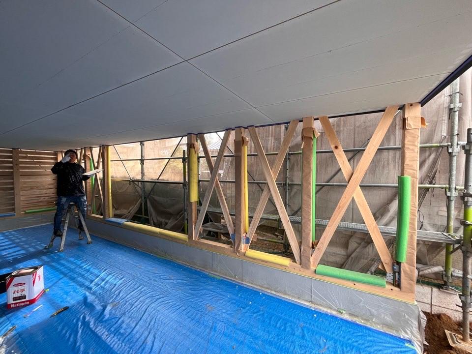 浅口市鴨方町本庄にて施工中のガレージ新築工事現場。 今日は塗装工程です 。