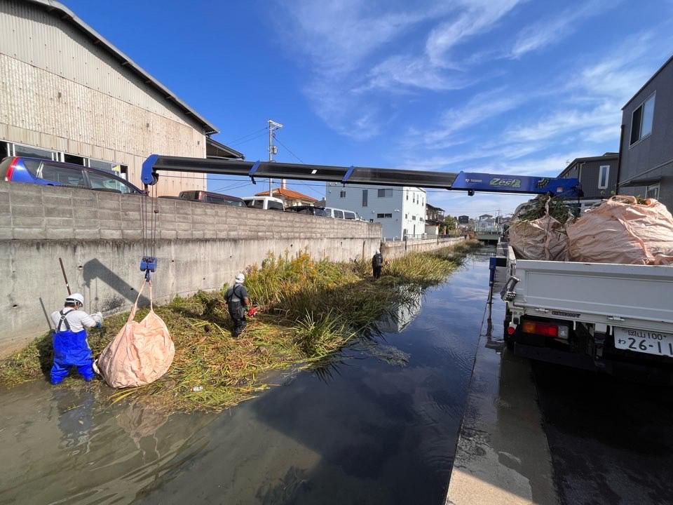 倉敷市中庄にて通水断面確保のため水路内の草刈をおこなっています。